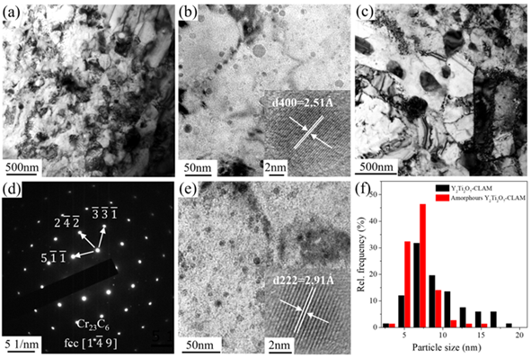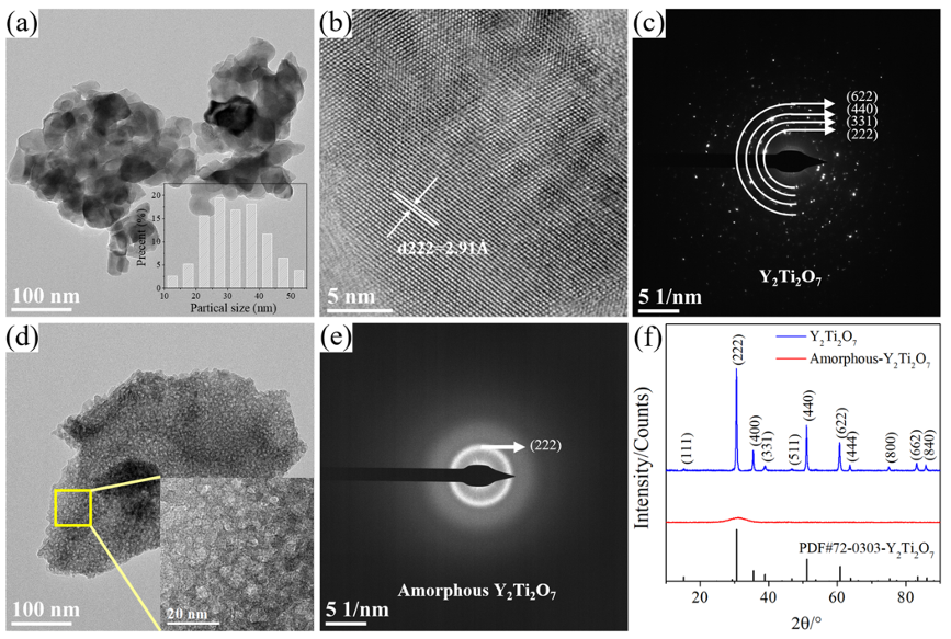 图1添加氧化物Y2Ti2O7的初始结构:(a-c) 纳米粉末;(d-e) 非晶粉末;(f) XRD图谱