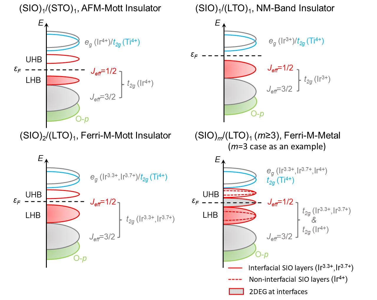 莫特(Mott)绝缘体-金属转变因其潜在的器件应用和掺杂后超导的可能性,在凝聚态物理学中引起了广泛关注。相比3d过渡金属氧化物中较弱的自旋轨道耦合效应,5d铱氧化物表现出显著增强的自旋轨道耦合,其能量已经与晶体场劈裂和电子关联效应相当。强自旋轨道耦合使得Ir 5d-t2g被分成Jeff=3/2和Jeff=1/2子带,库仑相互作用的引入进一步将Jeff=1/2能带分为上哈伯德能带和下哈伯德能带。层状Ruddlesden–Popper (RP)相Srn+1IrnO3n+1是具有代表性的铱酸盐材料,其中Sr2IrO4 (n=1)是反铁磁Mott绝缘体,具有满占据的Jeff=3/2带和半占据的Jeff=1/2带。由于和铜酸盐之间在结构、轨道占据和物性上有很多相似之处,Sr2IrO4被预测有希望通过电子掺杂而实现高温超导特性。随着n的增加,Jeff=1/2带宽从n=1的0.48 eV到n=∞的1.01 eV,导致Mott能隙的闭合。角分辨光电子能谱(ARPES)也证实钙钛矿SrIrO3体材料的半金属性质。然而,在界面二维极限下的SrIrO3却是和Sr2IrO4类似的反铁磁Mott绝缘体,这就给界面调控提供了可能。