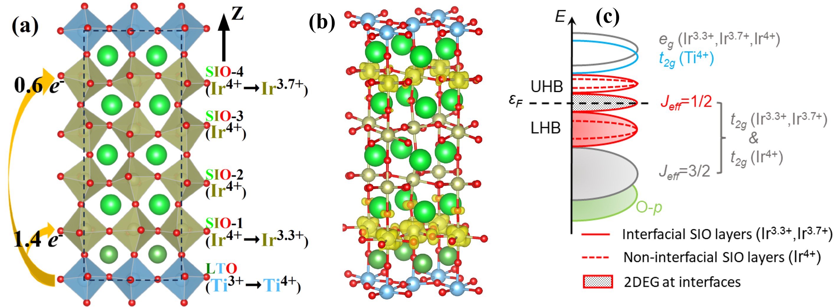 图2: 代表性的(SrIrO3)4/(LaTiO3)1超晶格的(a)异质界面结构, (b)局域于异质界面处的Ir-5d-t2g单原子层二维电子气,(c)基于Mott-Hubbard 模型描述的费米能级附近的能带图像。