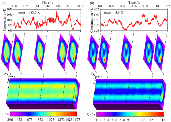 针对基线误差导致的吸光度畸变问题,团队刘锟研究员、王贵师副研究员、博士后王瑞峰等提出一种基于深度学习的吸光度恢复新方法。该方法通过建立神经网络模型,从导数信号恢复吸光度,具有抑制基线误差,降低吸光度畸变的效果,将吸收光谱单路径测量精度提高约1个数量级。利用此方法,该团队使用12束激光对柴油驱动的微型涡喷发动机尾焰温度和H2O浓度分布进行了非接触、高速测量,测量速度达到20kHz,温度测量误差与热电偶仅相差0.9%。这一技术突破有望提高层析吸收光谱量化精度。