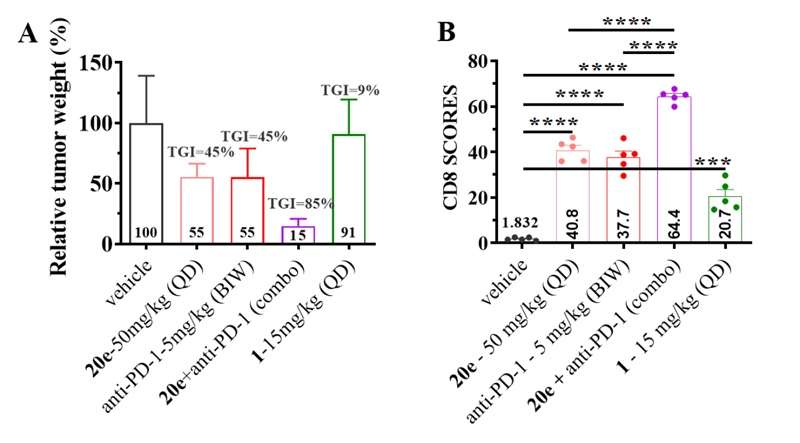 在本研究中,科研人员使用优势片段杂交组合的药物设计方法,通过构-效关系研究获得一种新型小分子PI3Kγ/δ双重抑制剂IHMT-PI3K-315。体外实验结果显示,该化合物在分子水平和细胞水平对PI3Kγ/δ激酶显示出高活性和高选择性。此外,IHMT-PI3K-315能够以剂量依赖性的方式将M2型巨噬细胞转变为M1型巨噬细胞,使肿瘤微环境中的免疫系统趋向激活状态。在体内实验中,该化合物表现出良好的药代动力学性质,并且在小鼠模型上有效地抑制肿瘤生长,特别是与免疫检查点抑制剂PD-1抗体联合使用时具有显著的协同抗肿瘤效果。进一步研究表明,IHMT-PI3K-315通过招募和激活CD8+ T细胞来抑制肿瘤生长。综上,本研究为肿瘤免疫治疗小分子药物的开发提供了新的候选药物。