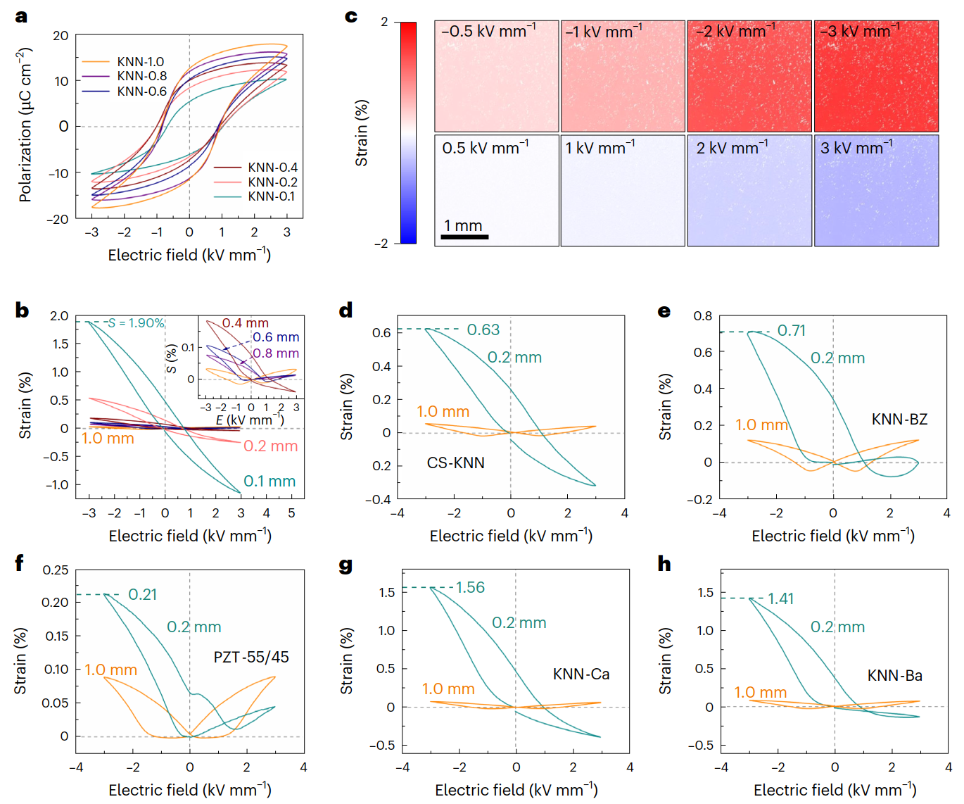清华大学材料学院及合作团队以热压烧结并经退火处理的KNN陶瓷为研究对象,展示了电致应变响应与陶瓷材料厚度的特殊依赖关系,并实现了1.9%的超高电致应变(在室温、3kV/mm、1Hz条件下,压电常数超过6300pm/V),相比传统KNN陶瓷提升了近50倍。通过多种原位测试表征手段,证实了该电致应变在面内分布较为均匀,且在小于3kV/mm的电场下,其主要贡献并非几何弯曲(如图1所示)。随着KNN陶瓷厚度降低,电致应变显著增加,并表现出电场下的非对称行为,这一现象也存在于其他压电陶瓷体系中(如图1)。