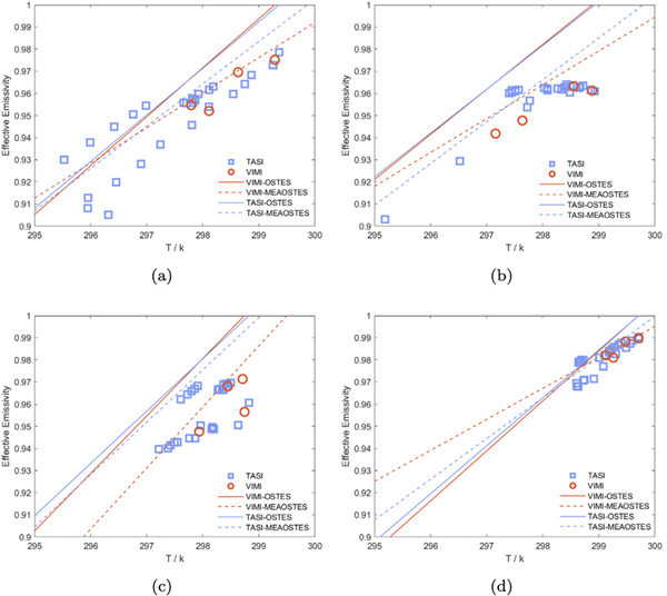 改进结合算法对不同类型地表的发射率与离地亮温拟合曲线精确结果图. (a)沥青屋顶;(b)白云岩大理石;(c)棕色粉质壤土;(d)草地