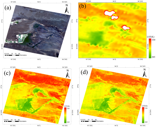 地表温度检索结果图.(a) GF-5B真彩色合成图像;(b)MODIS地表温度产品结果;(c)温度/发射率分离优化平滑算法反演结果;(d) 改进结合算法反演结果