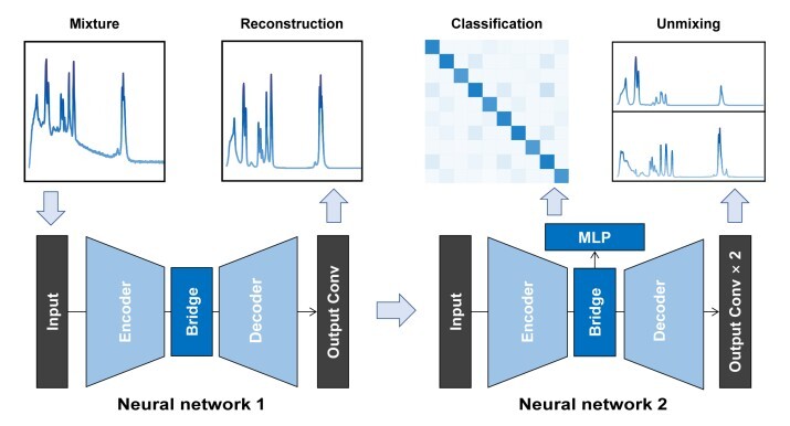 图1.级联神经网络实现混合微塑料拉曼光谱的重构,分类和解混