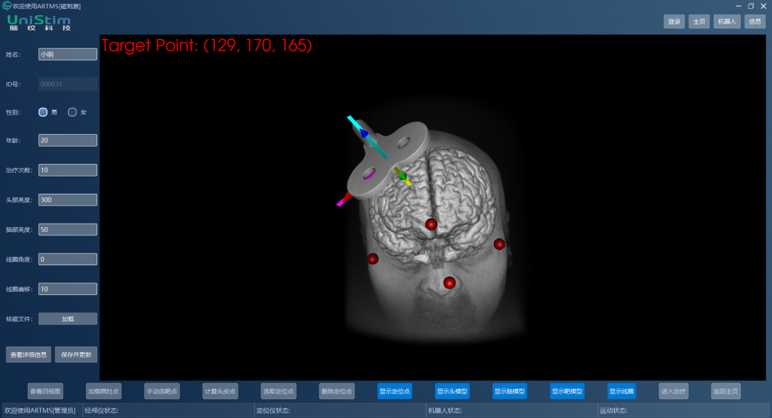 黄炫团队长期从事机器视觉、视觉定位导航、图像三维重建等智能系统相关技术研究。针对上述行业痛点,团队与安徽医科大学团队合作,将视觉定位导航与磁共振图像三维重建技术相结合,解决了TMS医疗机器人迈向自动化的技术瓶颈,实现“可视化精准导航”治疗。该系统搭载的智能导航技术,能够快速实现虚拟与现实的自动配准,在时间和空间上完成高精度特征捕捉和跟踪定位,并通过三维图像直观实时地显示患者脑区与治疗靶点的对应位置关系。基于双目视觉的智能定位导航技术是TMS 医疗机器人实现毫米级靶点定位与临床安全合规的关键,其精度直接决定了治疗线圈与脑区靶点的匹配度。根据最新临床治疗效果报告,TMS医疗机器人通过精准定位目标区域,避免刺激无关脑区,既减少了副作用,又缩短了治疗周期。