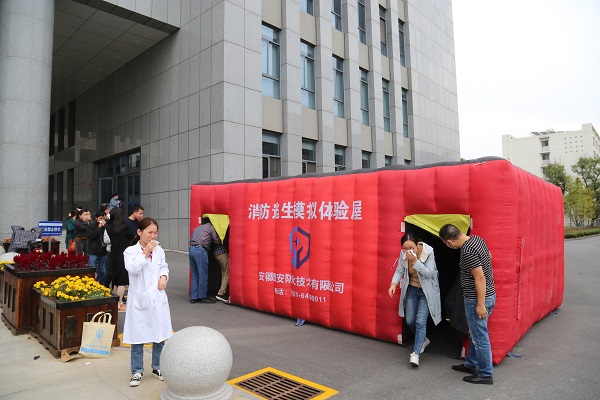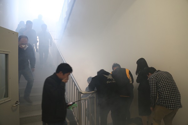 演练正式开始,交叉楼南楼3楼和6楼烟雾弹启动,瞬间消防通道浓烟弥漫,各楼层安全员引导职工和学生沿消防通道迅速有序的撤离,并不断提醒大家弯腰、捂口鼻、靠右侧墙壁等基本技能。到达疏散集合点后,在消防教育培训机构的教官进行指导下,大家进行了消防逃生屋的演练。