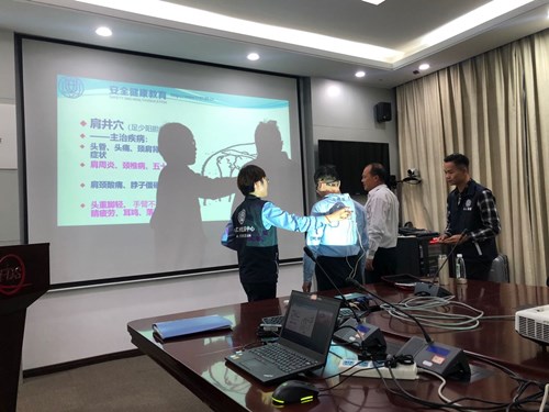 本次培训以视频学习的方式开头,温梦含生动地结合科研工作特性给大家讲解了心肺复苏、胸外按压、经络穴位养生、职业病的防治、雾霾天气的危害及健康防护等应急急救知识。并且,示范了经络理疗,与听众现场进行了互动。