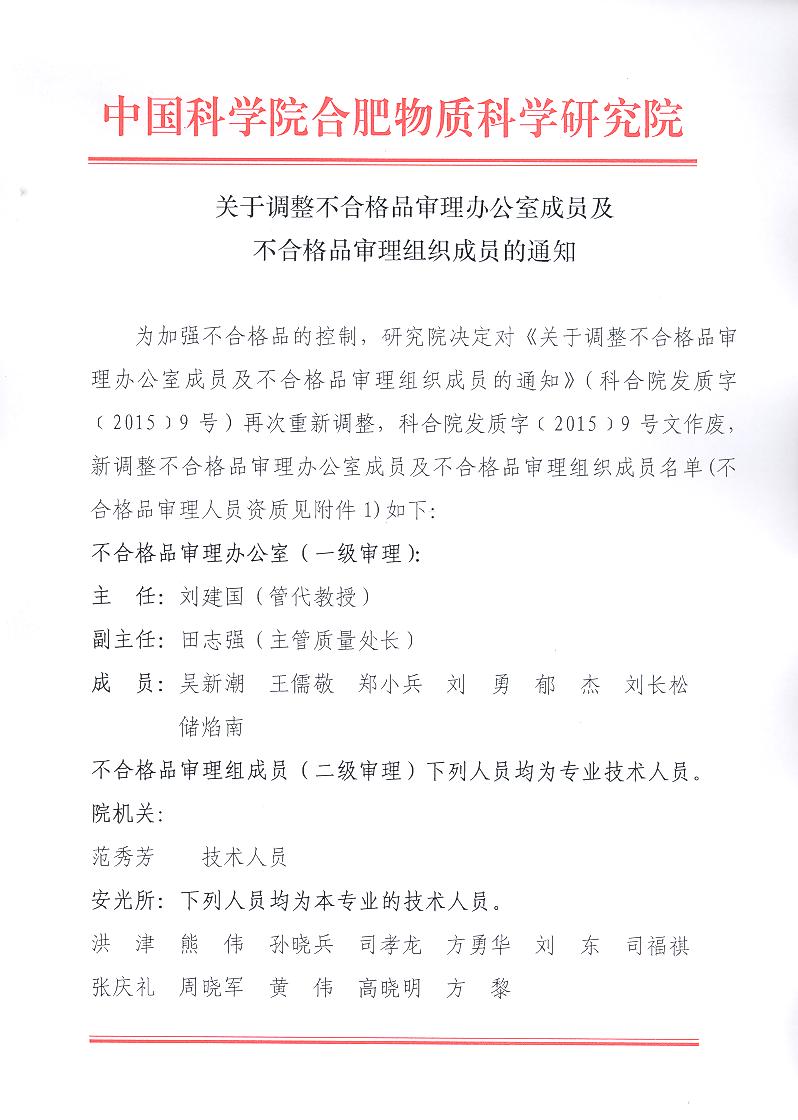 关于调整不合格品审理办公室成员及不合格品审理员的通知