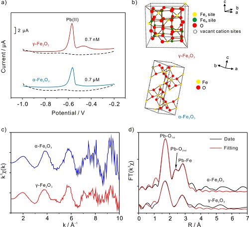 α-和γ-Fe2O3)花状结构对电化学检测Pb(II)的影响,并将它们的晶体结构与吸附容量和吸附方式紧密联系起来,从原子层面上揭示了电化学现象与晶体结构之间的关系。研究结果表明,γ-Fe2O3对Pb(II)的电化学响应要显著的优于α-Fe2O3 (如图a)。研究人员用XPS和EXAFS分析比较了α-和γ-Fe2O3对Pb(II)的吸附量以及吸附方式的差异。XPS的结果显示γ-Fe2O3表面暴露有大量的羟基(-OH),可以提供更多的吸附位点,从而提高对Pb(II)的吸附量,这是由于γ-Fe2O3的晶体结构使其表面有大量的吸附空位(如图b)。EXAFS的结果表明,Pb(II)在α-和γ-Fe2O3表面有着不同的吸附结合方式,Pb(II)在αFe2O3表面主要以Pb-OH和Pb-H2O的方式结合,而在γ-Fe2O3表面则只有Pb-OH (如图c和d)。这种不同的吸附容量和结合方式直接导致不同晶相的Fe2O3对Pb2+的吸附存在着显著的差异,从而影响两种晶相的纳米Fe2O3电化学分析行为的不同。