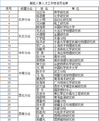 中国科学院人事局关于公布首批人事人才工作特派员名单的通知