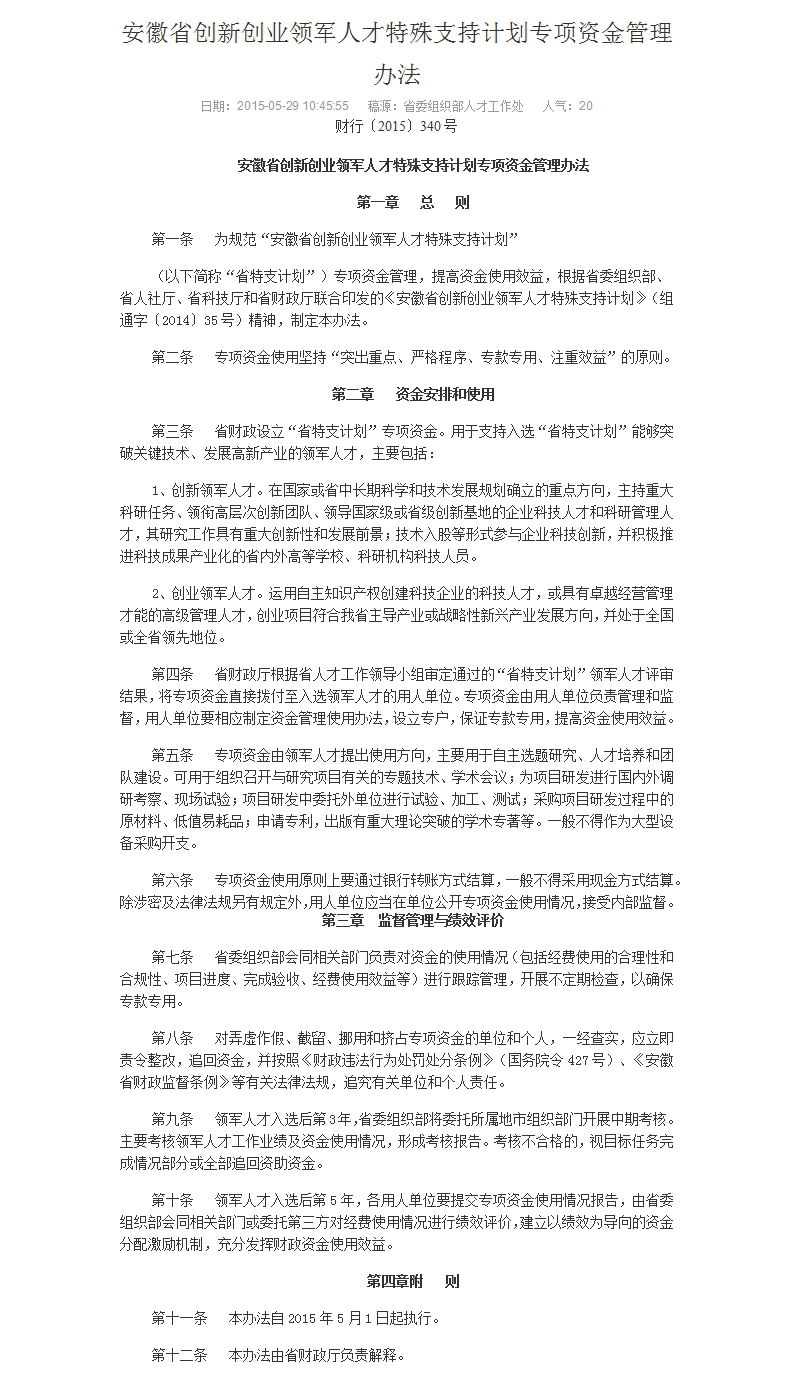 安徽省创新创业领军人才特殊支持计划专项资金管理办法