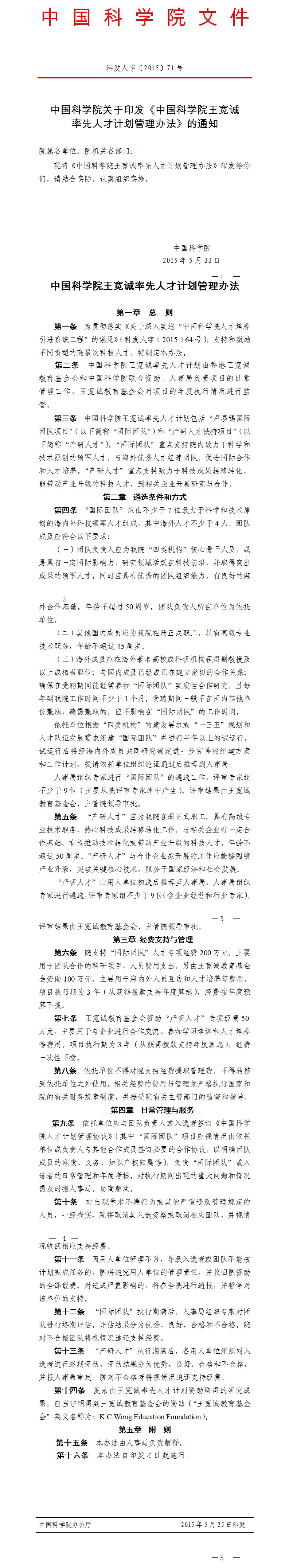 中国科学院关于印发《中国科学院王宽诚率先人才计划管理办法》的通知