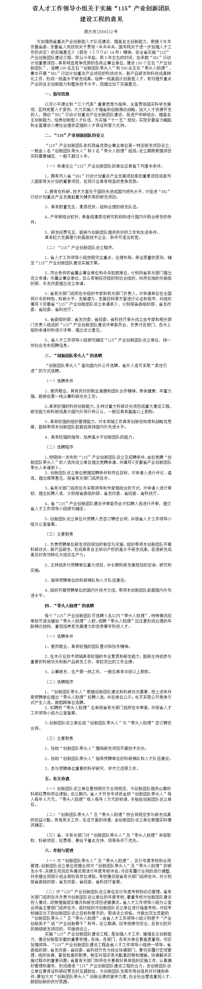 关于实施“115”产业创新团队建设工程的意见(皖办发(2006)12号)