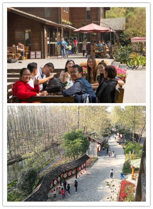 滨湖公园毗邻巢湖,在滨湖公园的门口就能看到美丽的巢湖,湖面上有渔家在捕鱼,巢湖的尽头和天空相连,这“秋水共长天一色”的景色美不胜收。在滨湖湿地公园门口合影后,大家随机分为几组自由游览,漫步在公园的小道儿上,金灿灿的梧桐树叶落叶归根。接着沿河边的小路继续游玩,公园内有水有桥,给人一种“江南水乡”的错觉。在一处阴凉处,大家围圈而坐,吃着自带的零食小吃,互相交流着学习生活经验,在紧张的学习和科研生活中寻得一丝放松,穿插的狼人杀游戏环节放松活跃气氛。休息结束后,大家细心把垃圾整理进行清理后继续游览。曲径通幽处,我们顺着一座小桥走过一段小路后来到了“牛家村”,远处传来83版射雕英雄传的主题曲,让大家有种亲身置身于电视剧中的感觉。在牛家村的羊肠小道上,摆放了各种传统文化与美食小吃,在途中我们登上了一座高楼,此楼是牛家村最高的建筑,站于楼顶俯瞰,全村的景色尽收于眼底,再次感受到美丽的公园景色如此爽心悦目!