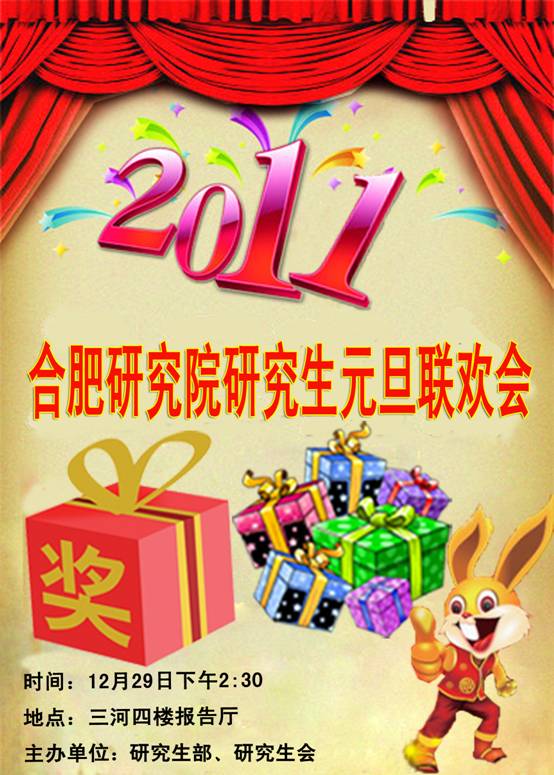 辞旧迎新,在2011元旦佳节到来之际,合肥研究院研究生部、研究生会将于12月29日下午举办合肥研究院研究生2011年元旦联欢会。