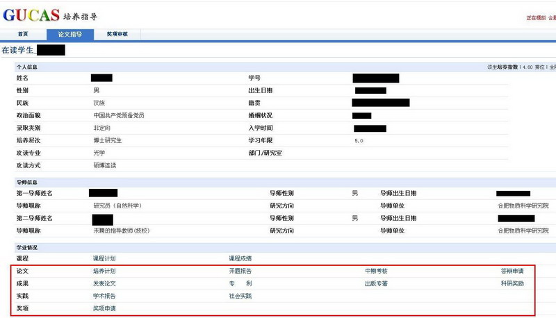 请参加本次学位论文答辩的各位同学,及时联系自己的导师,在提交纸质《论文答辩申请书》前,审核完成自己在研究生院教育管理平台培养指导系统填写的《开题报告》、《中期考核》,以及《学术报告和社会实践》等各项内容,如下图红色框内所示: