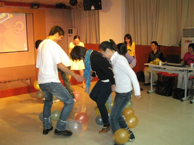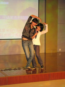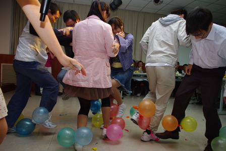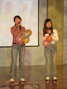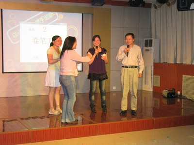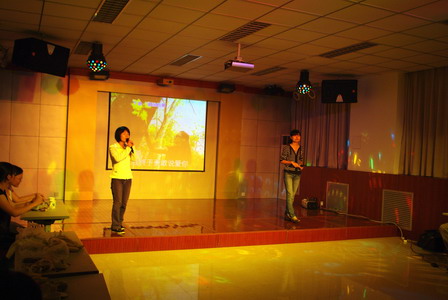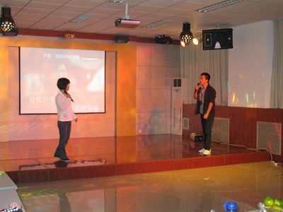 晚会在新生组合非常“4+3”的舞蹈——Para Para 樱之花下绽放开来。他们激情满怀,阳光动感,舞出了这个硕果累累的季节,人们丰收的喜悦,也舞热了台下同学们的心。千年中秋,巧遇祖国60华诞,月圆人圆情更圆——歌曲《花好月圆夜》《但愿人长久》,唱响了我们的美好生活。情歌《糊涂的爱》、《披着羊皮的狼》、《说爱你》、《你的眼神》、《冰雨》和《小芳》,演绎着不同的爱情。相声,是一种语言艺术,讲究说、学、逗、唱,邵定夫同学拿着班上大多数南方人普通话话发音不准开刷,抖着身边同学的身边事……艺术来源于生活,又高于生活!他的单口相声《说》,逗笑了全场的观众,赢得了阵阵的掌声!唐海宾的《超级魔术》看的大家意犹未尽,竞相猜测魔术背后的玄机。吉他伴奏歌曲《狮子座》和《童年》,帅气的男生用他们的吉他和歌声,深深打动了观众的心。游戏《踩气球》和《心有灵犀默契大比拼》,全场人声沸腾,师生同乐一堂,带动整场晚会走向最高潮……