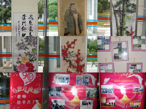 走进四号楼大厅,首先映入眼帘是十副精彩纷呈的书画,其中包括研究生自己撰写的书法作品和多幅国画,孔子的工笔画最为吸引眼球。在大厅中摆放的展板上陈列着三十多张师恩难忘的老照片,这些有着十余年甚至二、三十年历史的老照片,掀开了大家对往昔峥嵘岁月的追忆。此外,大厅还张贴的寓意丰富的海报,生动形象地表达了各个年级的研究生对老师感恩之情。
