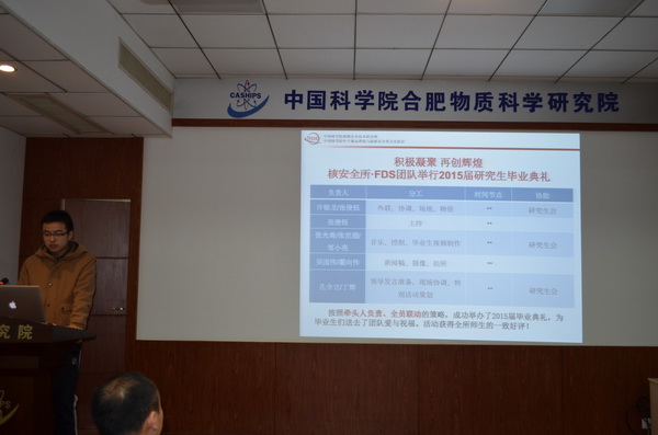 本次会议历时两个半小时,整场会议在热烈活跃的气氛中顺利完成。此次会议是中科大研究生院科学岛分院研会成立以来的第一次总结会,总结了过去的成绩和不足,规划了未来的工作,鼓舞了研会成员的士气,增加了大家的工作积极性,为研会2016年的发展奠定了坚实的基础。院研会的工作在新的一年里必将取得更大发展,谱写出更加灿烂辉煌的新篇章。