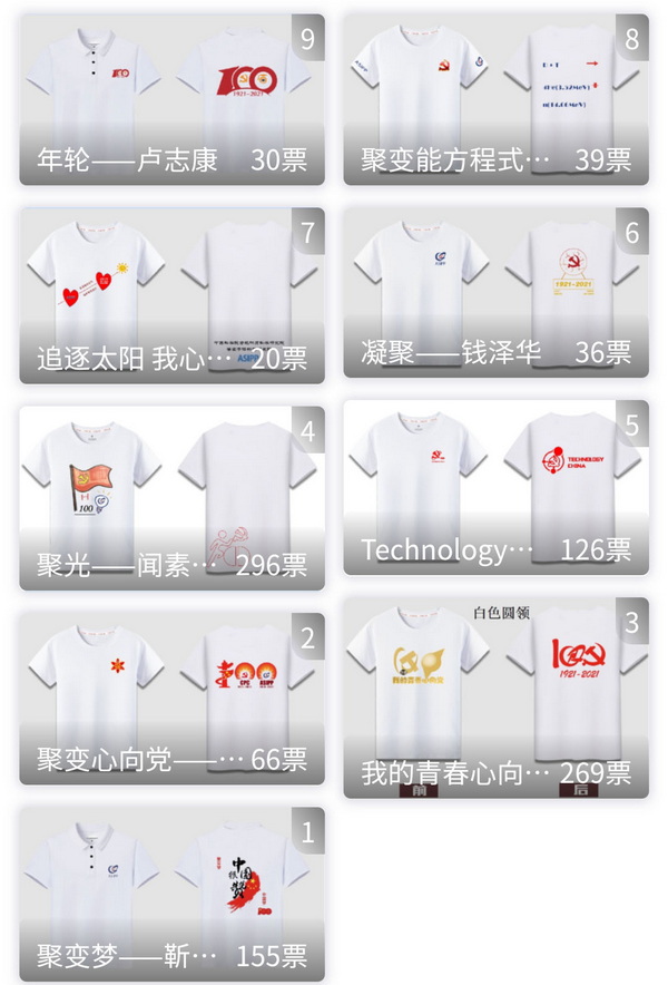 颁奖仪式上综合办主任黄素贞宣读本次文化衫设计大赛的获奖名单。闻素丽和陈镇的作品“聚光”荣获一等奖;马中洋、隋思源的作品“我的青春心向党”以及靳兴月的作品“聚变梦”获得二等奖;李雪纯的作品“Technology China”、 陶书、陈镇的作品“聚变心向党”以及陶书的作品“聚变方程式”获得三等奖;优秀奖的获得者分别为:钱泽华、卢志康、郑文明、张青、刘牛先、张振闯、陈青青。