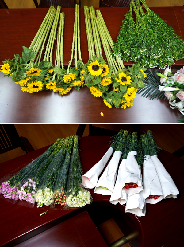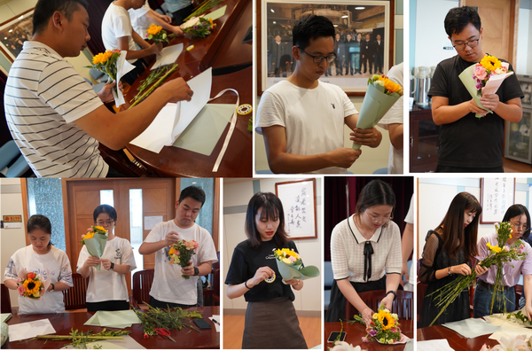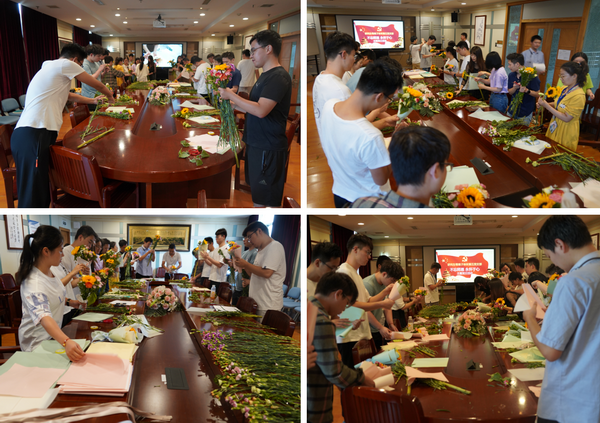活动开始前,支部书记李雪纯通过PPT分步讲解+视频结合的方式给学生党员从鲜花支数的挑选、鲜花品种的搭配、枝叶的修剪、花束的固定以及包装手法等方面详细讲解了如何包扎一束鲜花花束。然后,学生党员们根据教学步骤开始逐步学习包扎自己的鲜花花束。秋水蒹葭,不忘师恩。一束看起来简简单单的鲜花花束,花费了同学们几个小时的时间,期间有同学们反复尝试的努力,也有包扎成功的喜悦。最后,同学们将在教师节当天将亲手包扎的鲜花花束和贺卡送给自己敬爱的老师,用独一无二的创意为老师们献上一份份真诚的祝福。