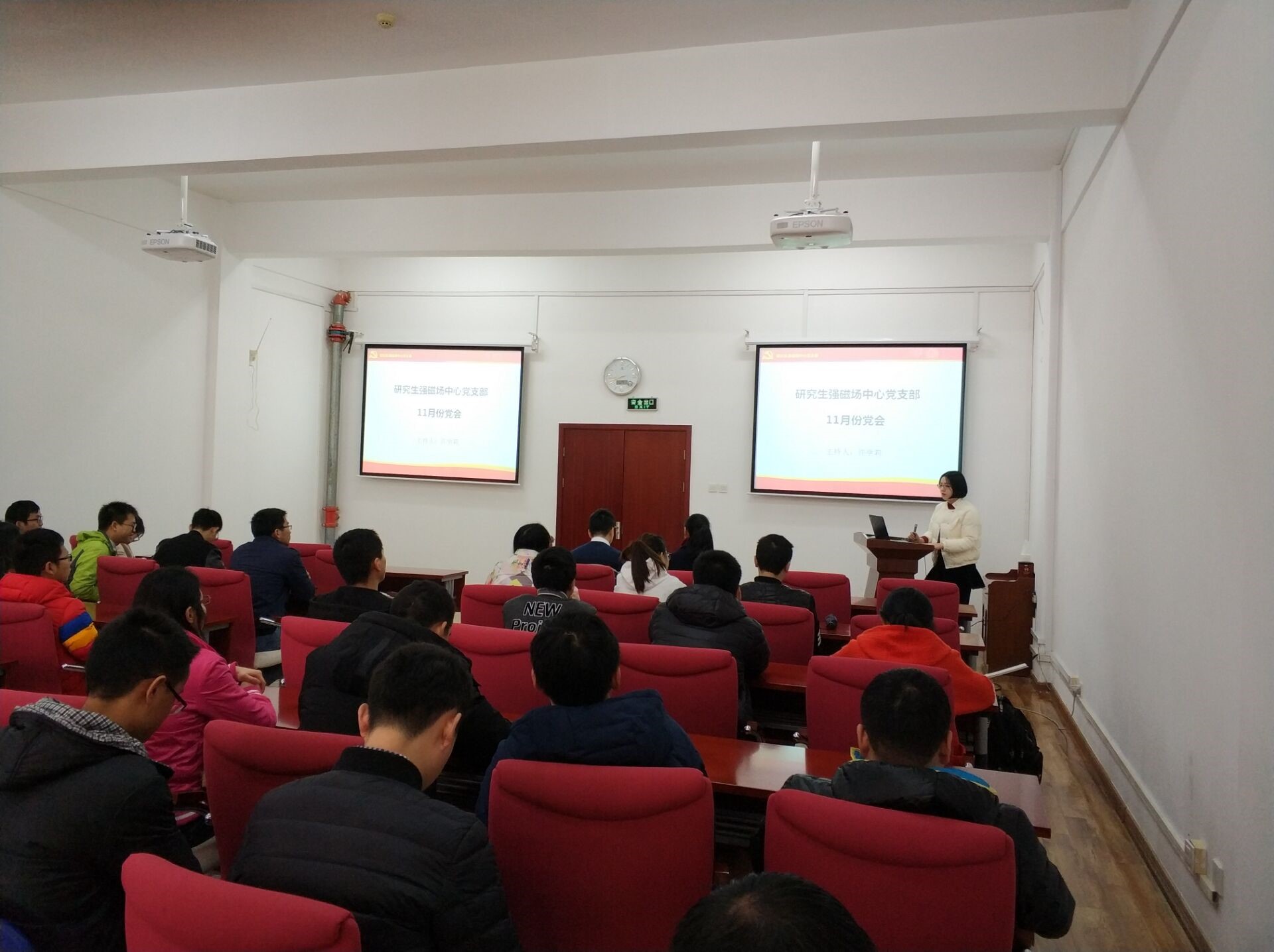 中午1200,支部会议准时开始,会议由支部书记许学莉同志主持。许学莉同志就如何深入学习“十九大”会议做了介绍:全体党员要认真学习《中国共产党章程》、《决胜全面建成小康社会》、《党的十九大报告》,了解新时代党的思想建设,理解新时代中国共产党的战略方针。在基层党组织从严治党方面,我们要贯彻落实从严治党、三会一课制度。另外,许学莉同志就今后将陆续开展的集体学习活动、党员活动日等等做了详细的介绍和要求,号召强磁场中心全体研究生党员要认真履行党员义务,将党支部的各项活动看作是提升自己的常规化过程,积极参与、认真思索,做一名符合时代要求的合格党员。