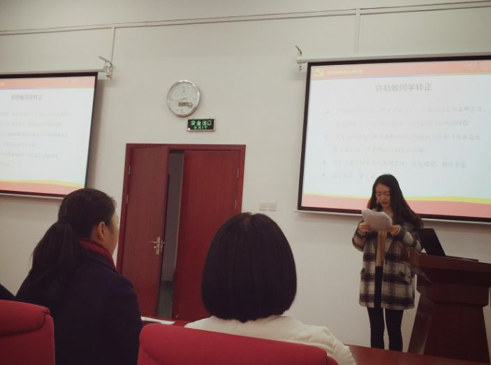 本次会议中,讨论了许劼敏同志的转正问题。许劼敏同志预备期满,向党组织正式提交并宣读了《转正申请书》,汇报了其在预备期的表现,总结了目前的主要优缺点、以及在党内生活的一些问题和努力方向,表达了对加入中国共产党的渴望。宣读过后,叶老师介绍了该同志在预备期内的培养工作和主要表现,随后对许劼敏同志比较熟悉的同学介绍了许劼敏同学在思想政治、生活、学习方面的努力和进步。最后大家经无记名投票表决,全票通过许劼敏同志按期转为中共正式党员。