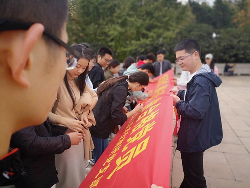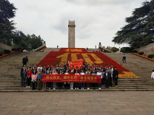 活动首先参观了南京雨花台烈士陵园,在烈士陵园纪念馆工作人员的引导和讲解下,同学们认真观看每一幅图片,每一尊雕像,聆听每一个感人至深的故事,深切感受到现在的和平生活来之不易。参观结束后,同学们来到烈士纪念碑前,怀着无比凝重的心情,在庄严肃穆的烈士纪念碑前敬献花篮并默哀致敬。随后,面对党旗,全体党员同学庄严的举起右手,重温入党誓词,铿锵坚定的誓词回响在烈士陵园上空,更印刻在在场的每一位年轻党员心中。