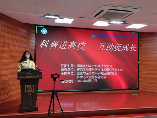 5月11日晚,由研究生健康与医学技术研究所党支部主办,健康与医学技术研究所研究生会、科学岛研究生科创协会以及福建水利电力职业技术学院共同协办的“科普进高校 互助促成长”主题活动如期举行。根据疫情防控要求,本次活动采用线上方式进行。
