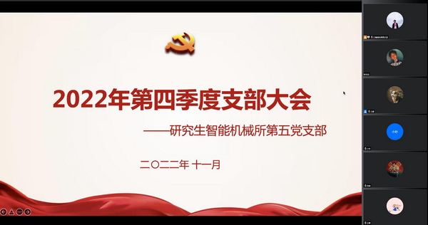 11月7日晚,研究生智能所第五党支部于线上召开党员大会,支部全体党员参会。会议主要分为两个议程,一是讨论关于卢昱同志是否能按期转为正式党员,二是讨论关于常燚同志是否能被接收为预备党员。会议由支部书记王瀚琪主持。