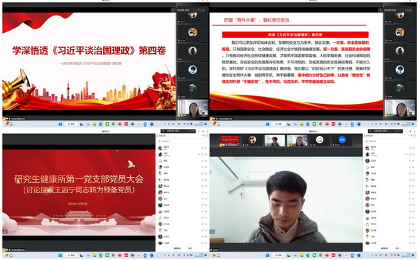 12月22日下午,研究生健康所第一党支部线上召开党员大会,开展“学深悟透《习近平谈治国理政》第四卷”主题学习与交流活动,会议由支部书记刘玥主持。