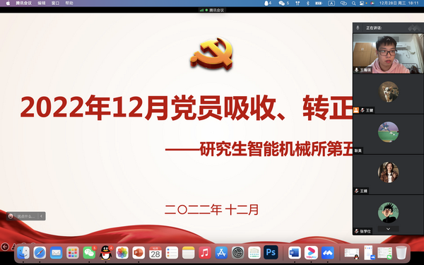 12月28日晚,研究生智能机械所第五党支部于线上召开党员接收大会。会议主要分为两个议程,一是学习中国共产党党史,二是讨论华琛、张鹏洁同志转正和刘子含、张勇同志转预备党员事宜。会议由支部书记王瀚琪主持。