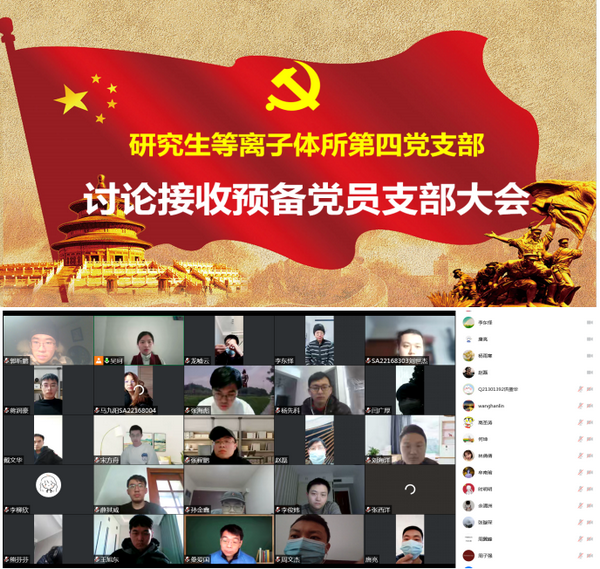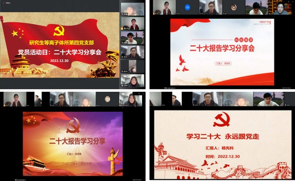 12月30日,研究生等离子体所第四党支部以线上会议的形式召开了党员大会暨十二月主题党日活动。会议讨论了关于杨先科同志的支部党员接受工作,并举行了二十大报告学习分享会。会议由组织委员张海彪主持。