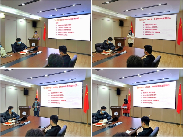 会议首先讨论了接收张宇卓同志为预备党员。张宇卓同志宣读《入党志愿书》,向党组织汇报对于党的认识、入党动机、个人经历及入学表现等。随后和宁宁、徐应生、曲肖璇三位同志分别对预备期间的思想动态、工作生活等情况做出汇报,认真分析总结了不足,明确了今后的努力方向。入党介绍人报告了相关情况、支委会报告审查情况。与会党员充分讨论,以无记名投票方式表决,一致同意以上四名同志的发展和转正。