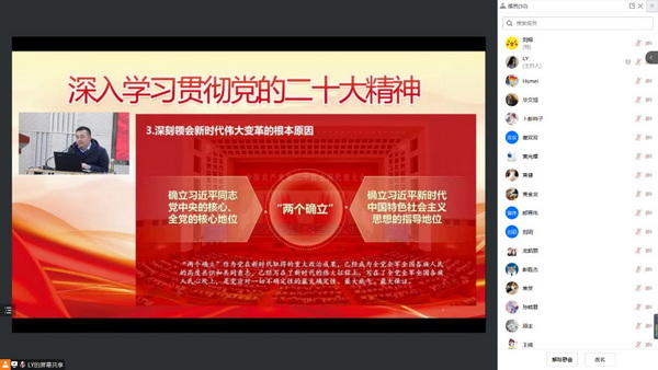 3月3日下午,合肥研究院机关第二党总支与研究生党委在科学岛会议中心联合举办党的二十大精神和新党章专题学习报告会。研究生健康所第一、第二党支部组织支部党员、入党积极分子线上集体参加本次学习报告会。