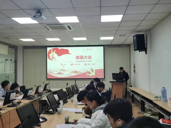 会议第三项,研究生安光所第一党支部换届选举大会,首先由研究生党委委员吴涛同志宣读《关于同意研究生安光所第一党支部换届选举的批复》,并由上届支部书记肖岚同志做2022年度工作总结,提出了对下一届支委的期望,随后举手表决通过了选举草案。接着举手表决了本次换届选举大会的监票、计票人。在公布支委候选人名单后,各位候选人进行了竞选汇报,并由到场正式党员进行无记名投票选举,本次投票以差额选举产生了由:史佳庆、金致含、陈静远、汪军四位同志组成的新一届支委。