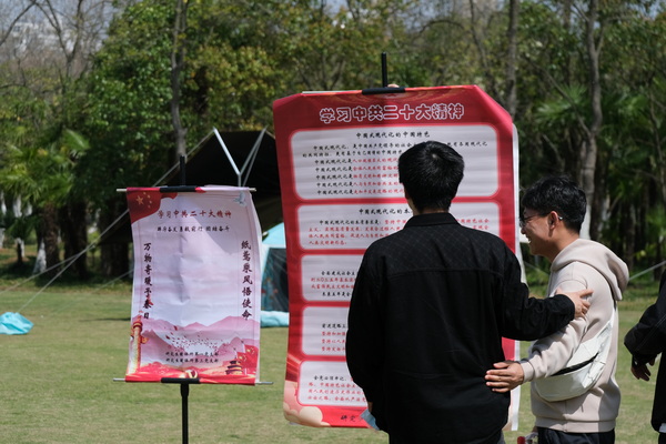 首先,为引导党员深刻领悟和把握大会精神实质和丰富内涵,支部设计相关展报,带领同志共同学习二十大精神和两会精神,鼓励大家踔厉奋发勇毅前行,感悟新时代使命。同时,户外展览的形式也吸引了部分公园游客观看。观看过后大家纷纷在海报上留言,表达对祖国的祝福以及对未来的期许。