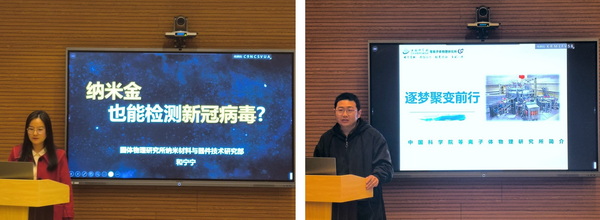 科普报告环节,和宁宁和李子兀分别作了题为《纳米金也能检测新冠病毒?》和《逐梦聚变前行》的科研交流报告,具体介绍了液相激光加工制备纳米粒子研究进展、中国可控核聚变发展历程。报告加强了党员对科研现状的了解,拓宽了党员的知识面,引起了大家的广泛兴趣。