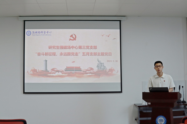 为进一步促进支部党员学习和交流,更好地发挥毕业生党员先锋模范作用,5月30日,研究生强磁场中心第三党支部在交叉科研楼南楼207会议室开展了 “奋斗新征程,永远跟党走”主题党日活动,会议由支部书记章鹏主持。