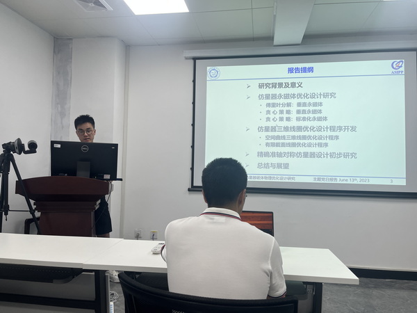 支部书记谢朋成首先热烈欢迎了本支部的陆志远同志,并向在座党员介绍了陆志远同志的个人经历。陆志远,中科大博士,2023届校优秀毕业生,发表过多篇文章,其中包括3篇SCI一区文章,获得两次国家奖学金、所长奖学金等多项奖学金。随后,陆志远同志开始了报告,内容涉及仿星器的发展历程、永磁体仿星器的优缺点、永磁体块的设计优化方法、精确准轴对称仿星器的初步设计研究等方面,为大家介绍了当前仿星器研究领域的前沿进展。最后的交流环节,陆志远同志向大家分享了就业思路,鼓励大家尽早树立目标,积极科研,把握机会,争取找到心仪的理想工作。