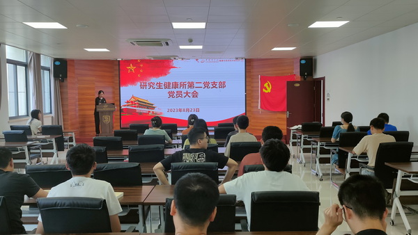研究生健康所第二党支部于2023年8月23日召开党员大会。会议议程包括“自觉履行高水平科技自立自强的使命担当”主题党课学习和纪律委员换届选举。会议分为交叉科研楼和中科院合肥肿瘤医院两个分会场,会场之间通过腾讯会议互动。