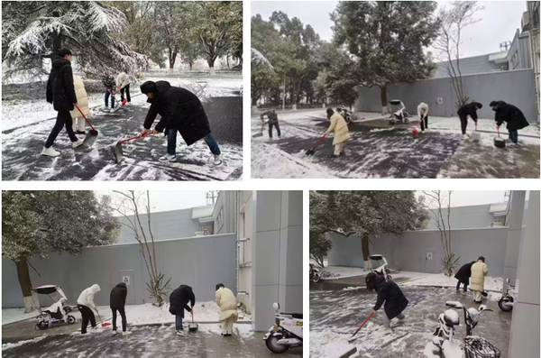 工欲善其事,必先利其器。首先与物业或管理员对接,准备好除雪工具。在相关事务协调好之后,短时间内集结党员二十余人。白雪皑皑,寒风阵阵,并没有阻挡广大学生党员扫雪除冰的热情。同志们拿着雪铲细致地铲开层层积雪,合理分工,践行着“为人民服务”信念,将办公室楼下及实验室外积雪清理干净。党员清理积雪的行动给大家带来的不单单是方便、安全,更是传递了一份温暖和正能量。