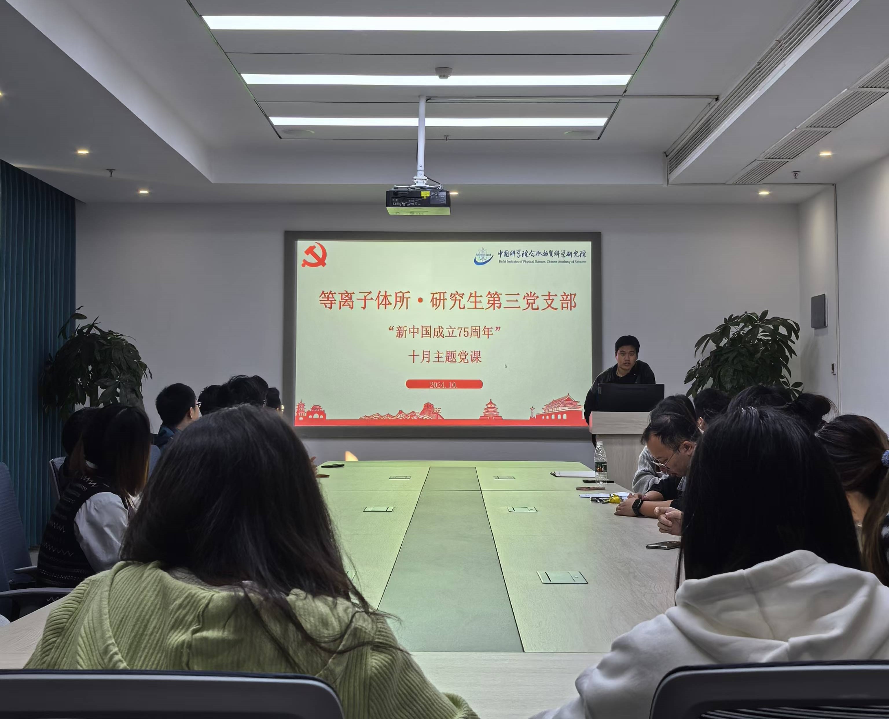 为庆祝新中国成立75周年,10月29日,研究生等离子体所第三党支部在四号楼四楼中间会议室召开支部党员大会,以党课的形式开展“新中国成立75周年”精神学习。会议由支部书记李解同志主持。