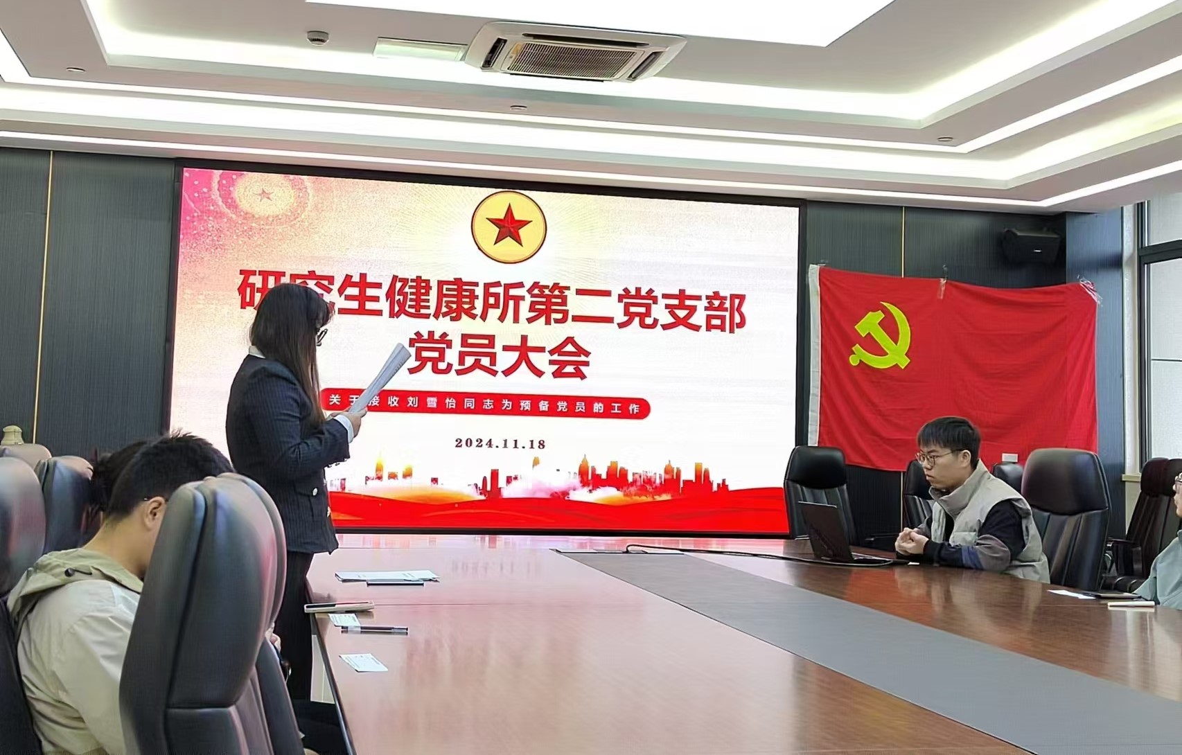11月18日,研究生健康所第二党支部在交叉科研南楼908组织召开党员大会,会议由支部书记刘亚鹏同志主持,会议主要内容为刘雪怡同志的预备党员接收工作。