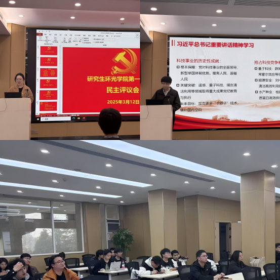 3月12日下午2点,研究生环光学院第一党支部于科学岛安光所一号楼219会议室召开党员大会暨主题党日活动,全体党员参与。会议议程包括:研究生环光学院第一党支部换届选举大会、2024年度民主评议、组织生活会以及“科创筑基,正纪铸魂”主题党日活动,会议由汪颖同志主持。