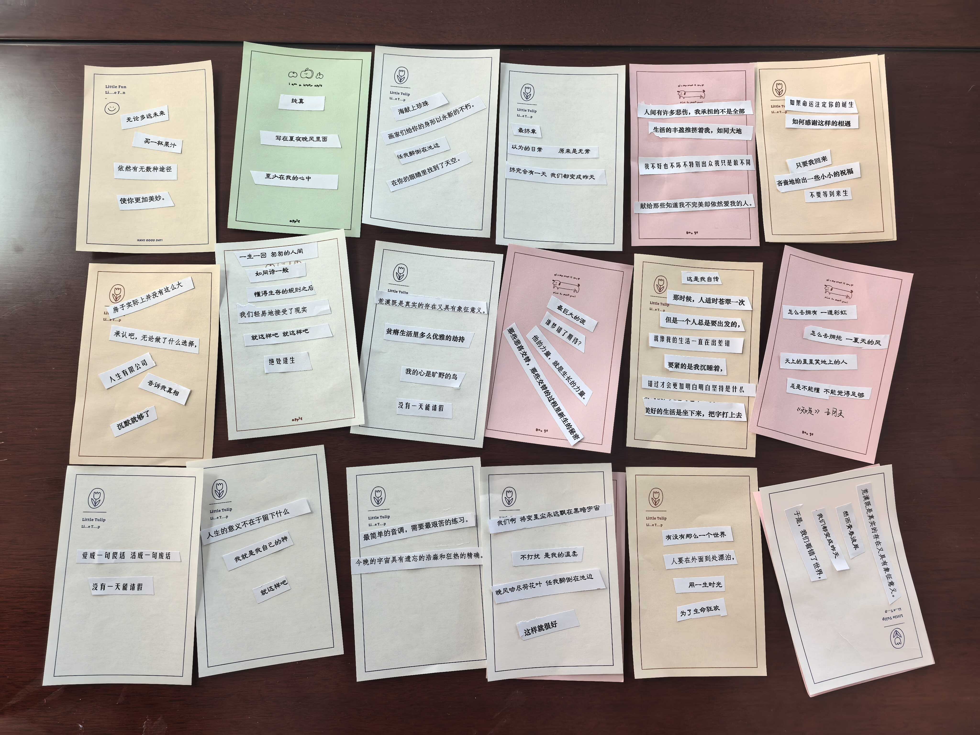 活动中,支部党员通过拼贴诗的形式将不同的词语和短语组合在一起,打破固有的思维模式,提炼零碎的诗意,把文字纸条拼贴成诗。为了让支部党员从专业名词中暂时抽离,感受文字的力量,党支部提供了贴纸字句、胶棒、马克笔等,鼓励大家发挥自己的想象力与创造力,打碎固定的文本排列,将表达从刻板苍白的语句中解放出来,开启自己的诗意之旅。此次活动,支部党员踊跃参与,创作出一篇篇风格迥异、个性鲜明的拼贴诗作品。