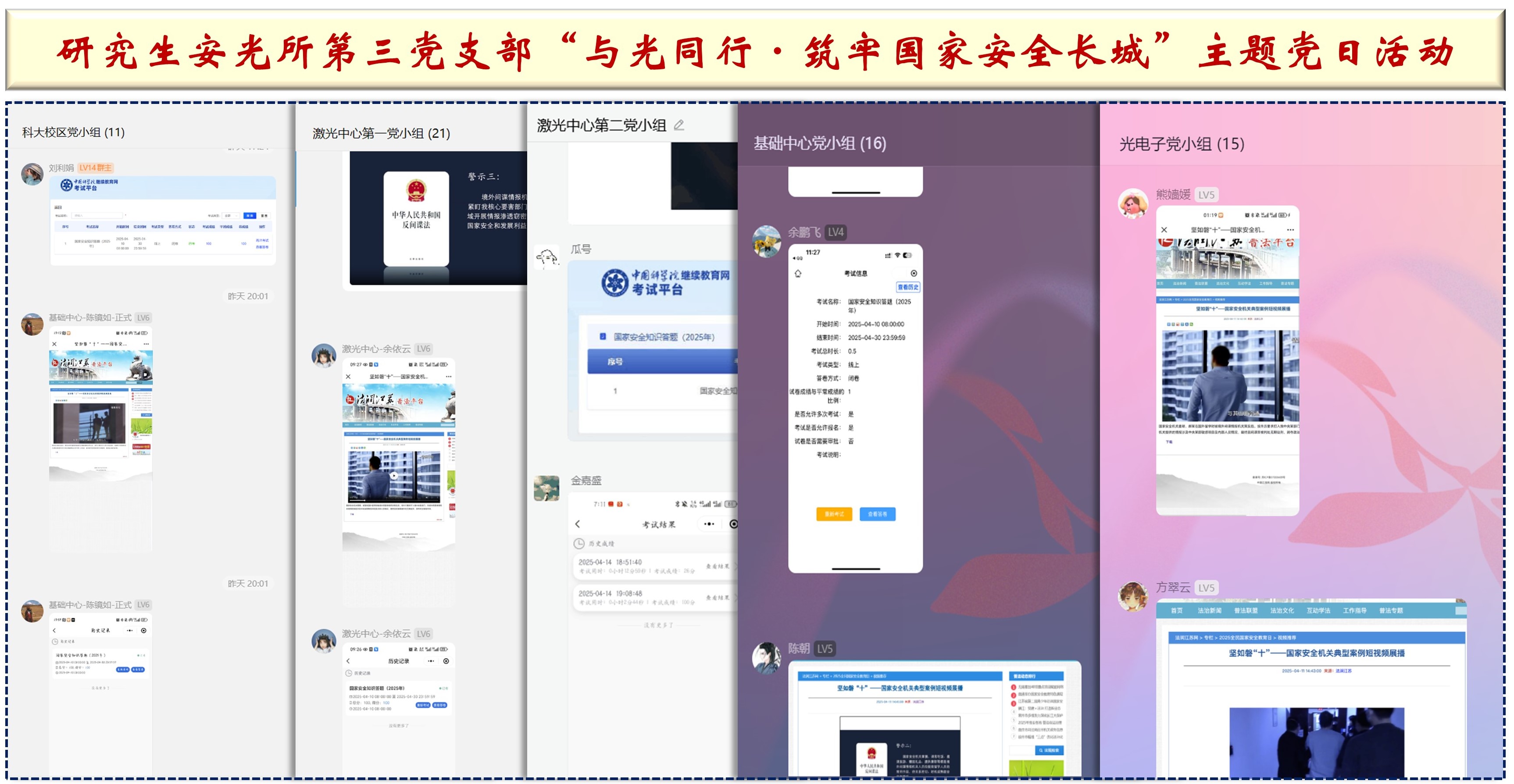 4月15日,在第十个全民国家安全教育日暨《中华人民共和国国家安全法》颁布十周年之际,研究生安光所第三党支部组织开展"与光同行·筑牢国家安全长城"主题党日活动,以立体化学习提升党员国家安全意识。