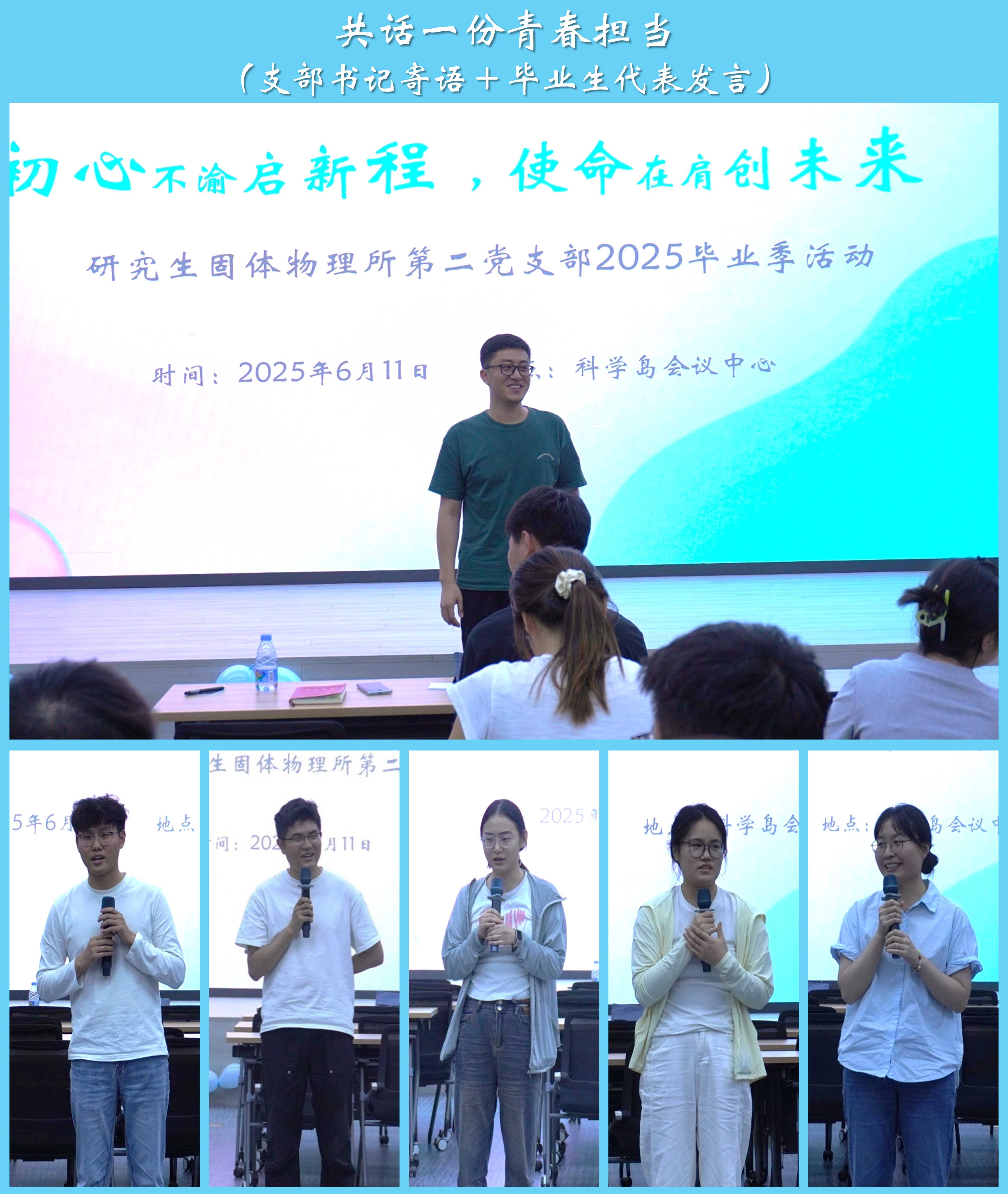 为强化青年党员使命担当、激发支部成员的创新活力,研究生固体所第二党支部于6月11日在科学岛会议中心开展“初心不渝启新程,使命在肩创未来”主题党日活动。内容包括党支部书记毕业寄语、毕业生党员倾囊相授及“逐梦启程,趣玩一夏”毕业欢送三个部分,党支部副书记刘贺主持,全体党员参加。