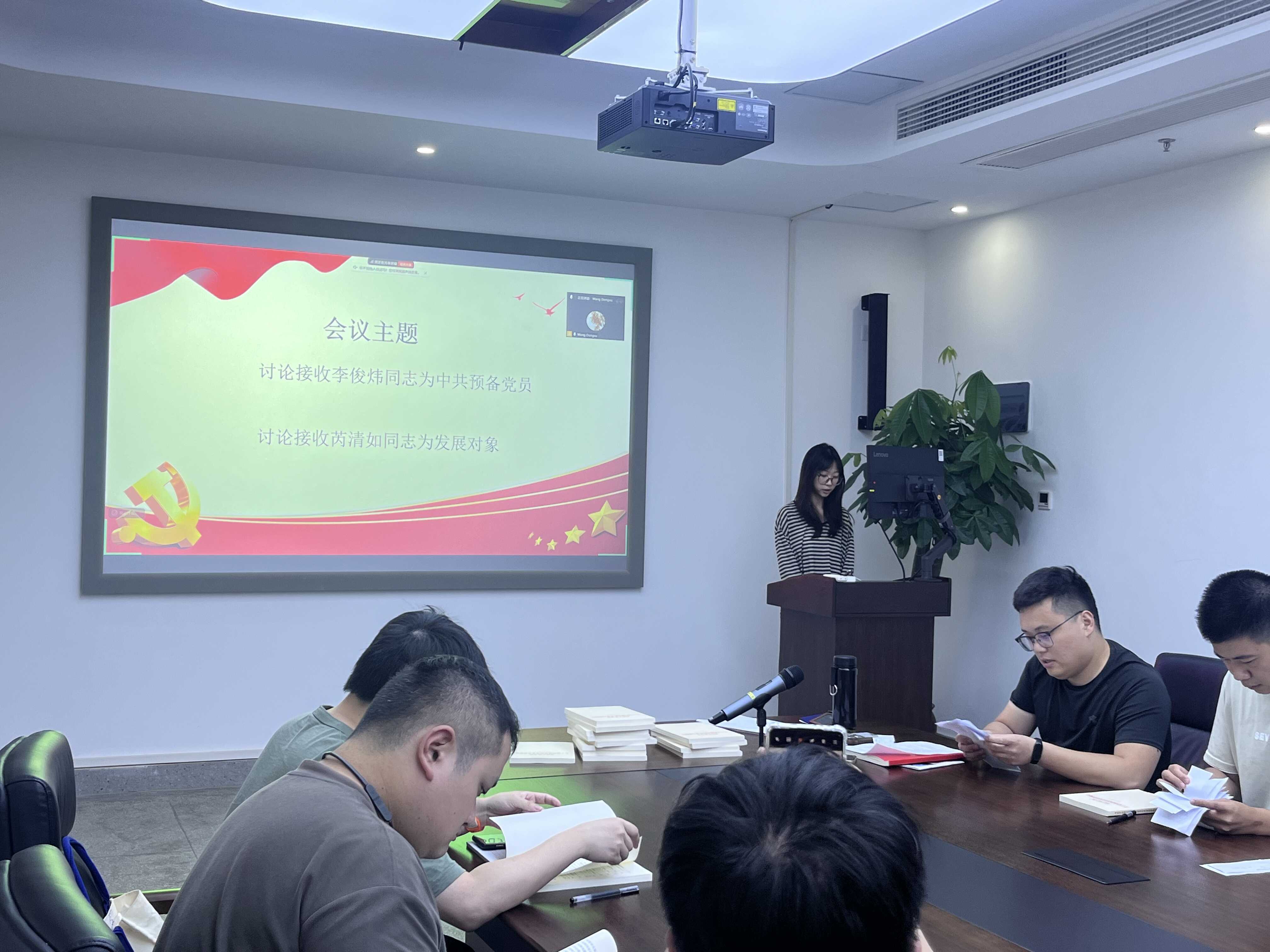 会议最后,邓羽佳代表支部委员会,对李俊炜同志光荣地被接收为中共预备党员表示热烈祝贺,希望他以此为新的起点,严格要求自己,提升党性修养,积极发挥先锋模范作用,争取按期转为正式党员。同时,也对芮清如同志被确定为发展对象表示祝贺,鼓励她系统学习党的理论,以党员标准规范言行,积极向党组织靠拢,争取早日加入党组织。